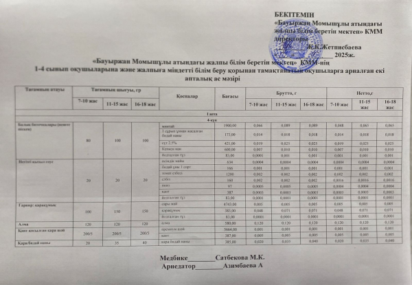 2025-2026 жылдарға арналған бастауыш сынып оқушыларына және жалпыға міндетті білім беру қорынан тамақтандыруды ұйымдастырудың 2 апталық ас мәзірі