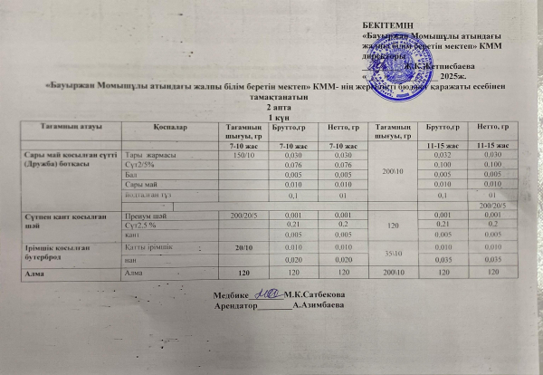 2025-2026 жылдарға арналған бастауыш сынып оқушыларына және жалпыға міндетті білім беру қорынан тамақтандыруды ұйымдастырудың 2 апталық ас мәзірі 06.10.2025