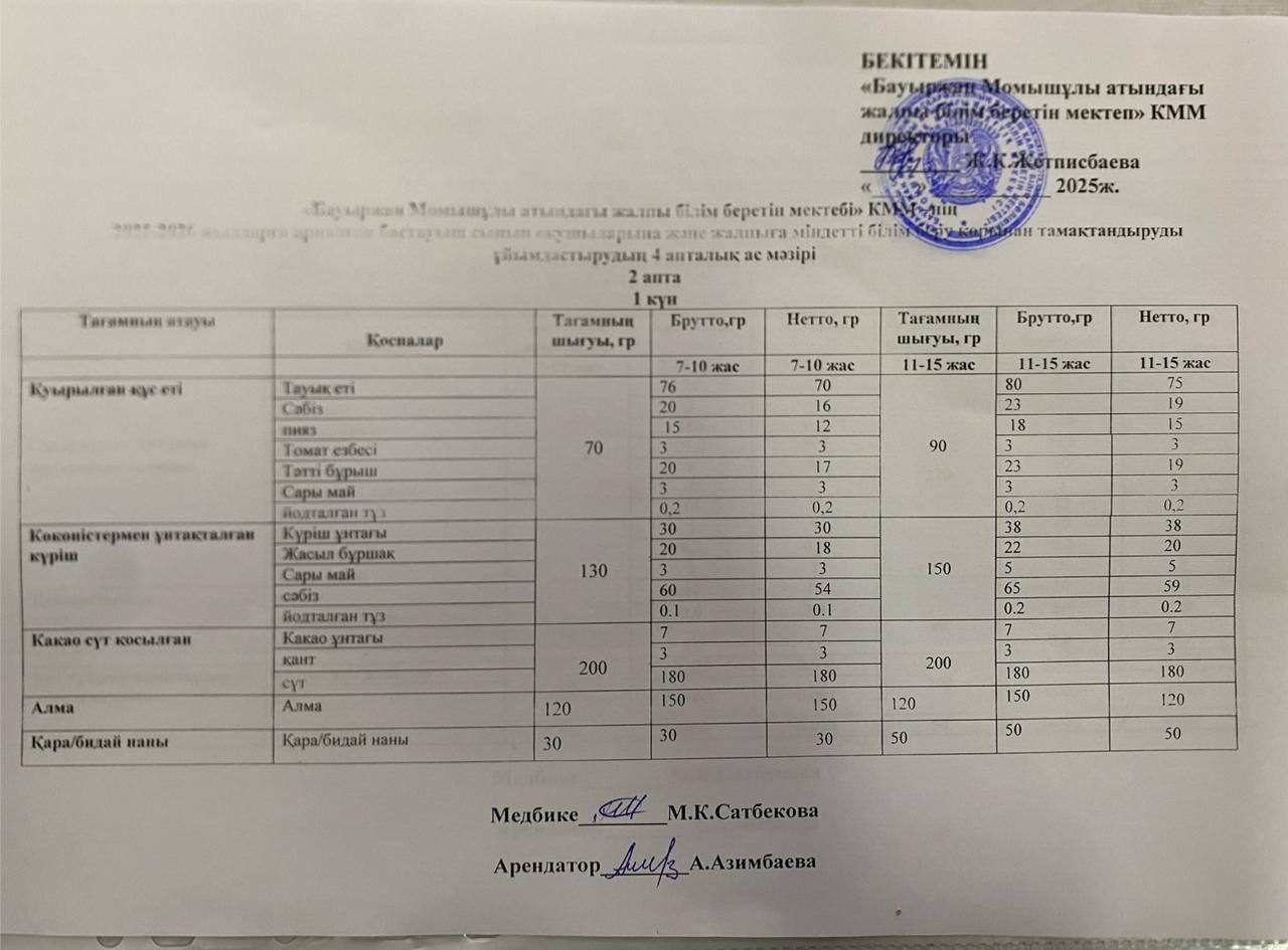 2025-2026 жылдарға арналған бастауыш сынып оқушыларына және жалпыға міндетті білім беру қорынан тамақтандыруды ұйымдастырудың 4 апталық ас мәзірі 10.11.2025