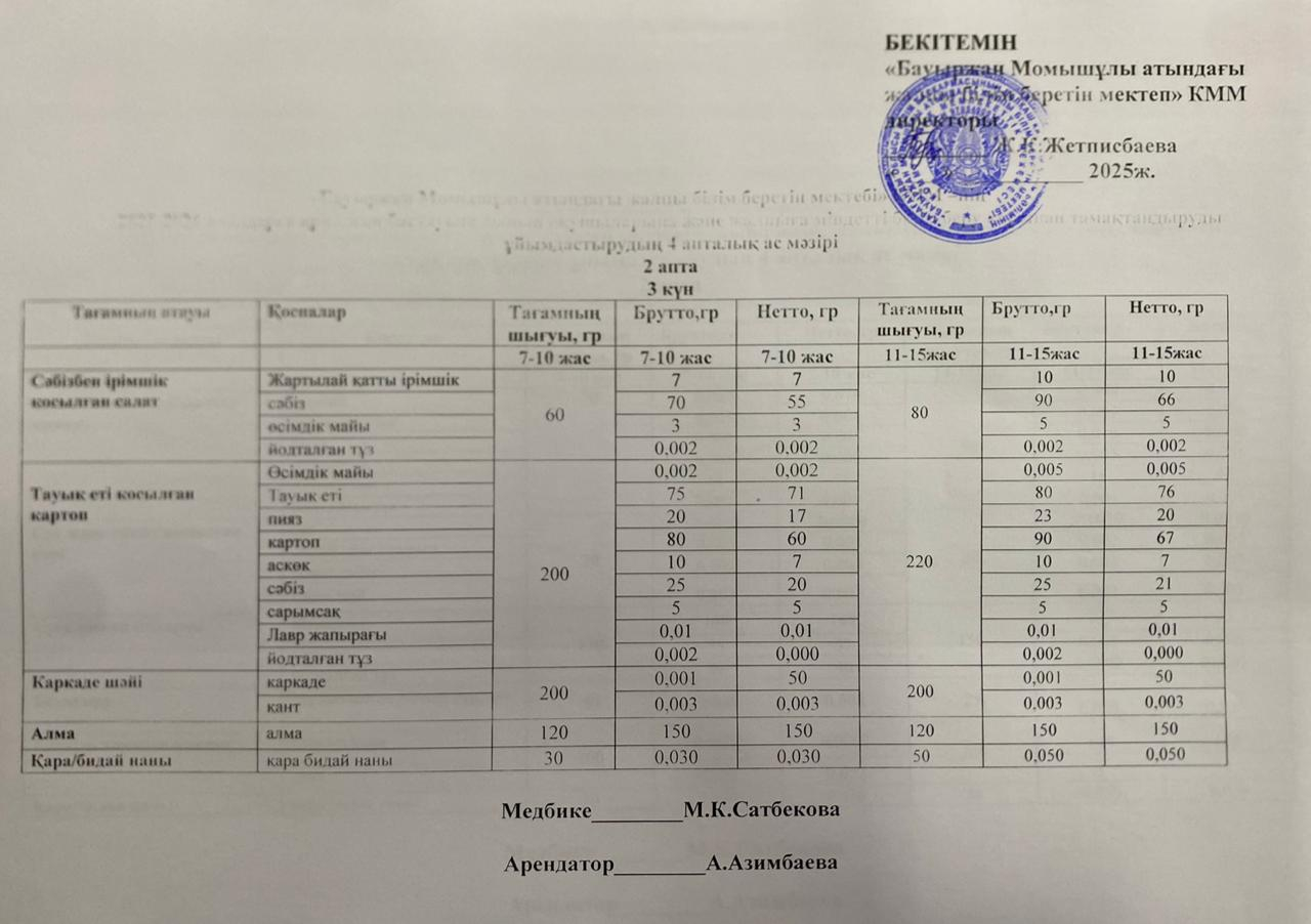 2025-2026 жылдарға арналған бастауыш сынып оқушыларына және жалпыға міндетті білім беру қорынан тамақтандыруды ұйымдастырудың 4 апталық ас мәзірі 12.11.2025