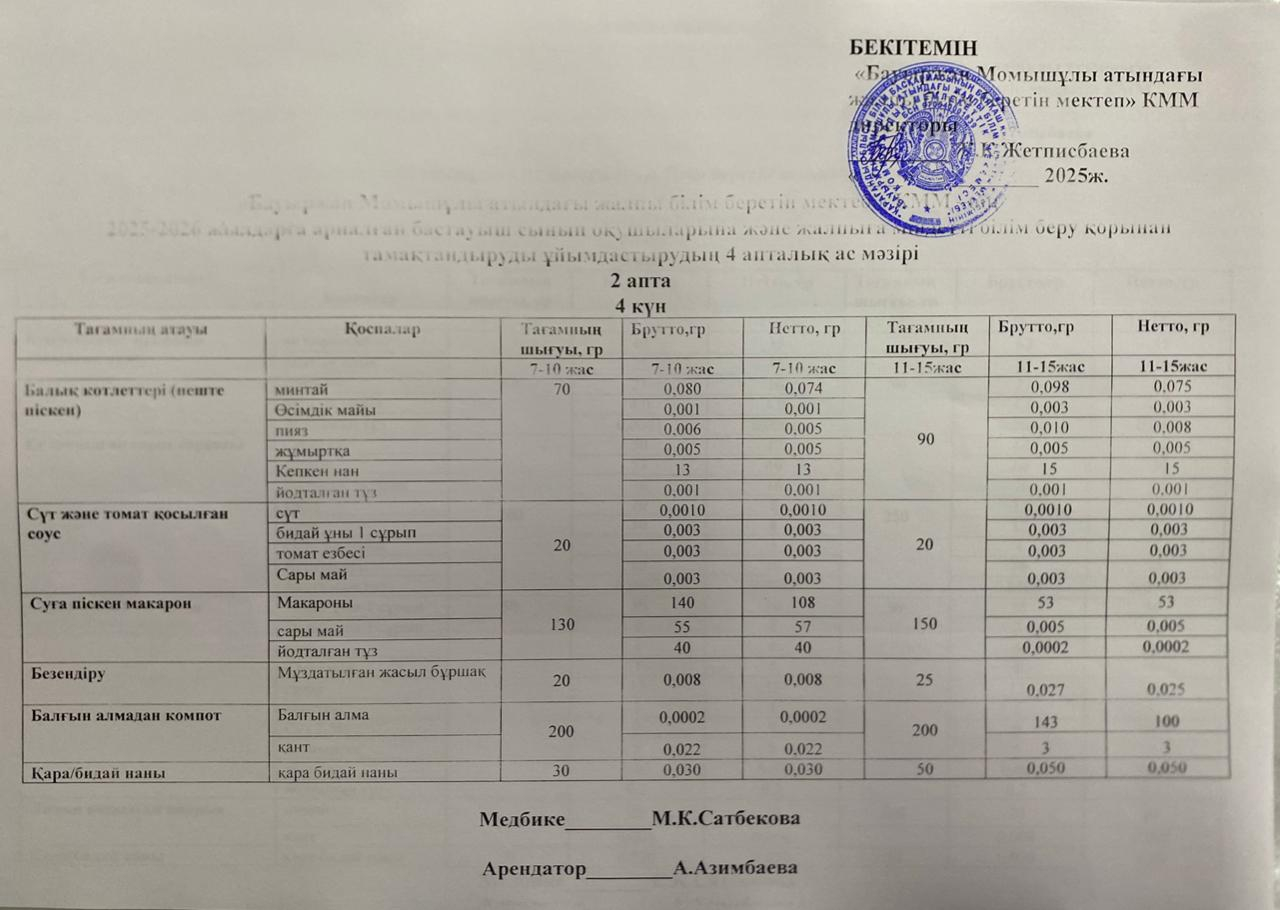 2025-2026 жылдарға арналған бастауыш сынып оқушыларына және жалпыға міндетті білім беру қорынан тамақтандыруды ұйымдастырудың 4 апталық ас мәзірі 13.11.2025