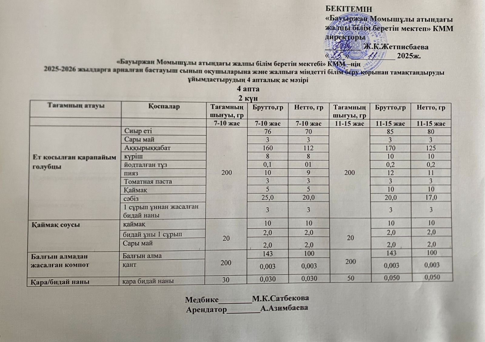 2025-2026 жылдарға арналған бастауыш сынып оқушыларына және жалпыға міндетті білім беру қорынан тамақтандыруды ұйымдастырудың 4 апталық ас мәзірі 25.11.2025