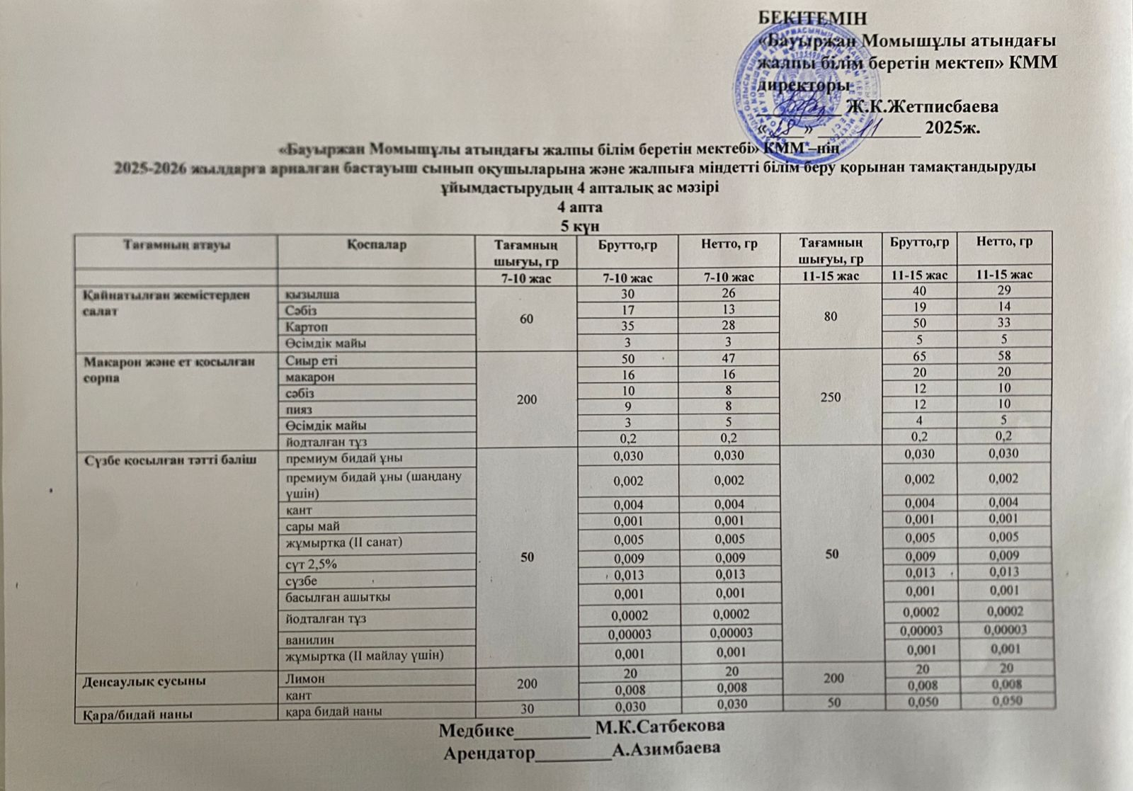 2025-2026 жылдарға арналған бастауыш сынып оқушыларына және жалпыға міндетті білім беру қорынан тамақтандыруды ұйымдастырудың 4 апталық ас мәзірі 28.11.2025