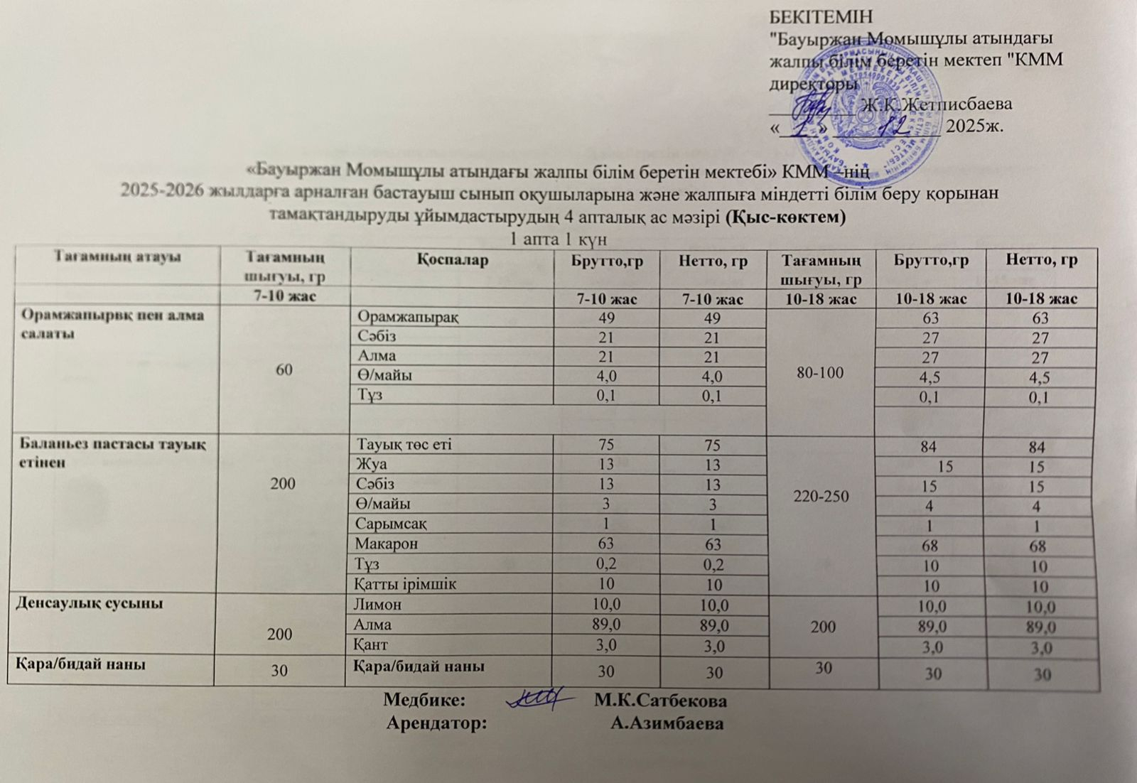 2025-2026 жылдарға арналған бастауыш сынып оқушыларына және жалпыға міндетті білім беру қорынан тамақтандыруды ұйымдастырудың 4 апталық ас мәзірі (қыс-көктем) 01.12.2025