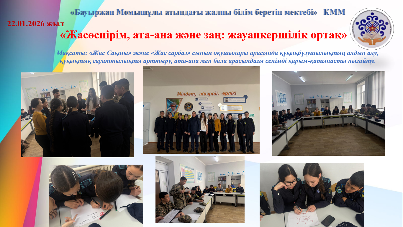 Мектебімізде 22.01.26 күні «Жасөспірім, ата-анажәнезаң: жауапкершілікортақ» тақырыбындаинспекторменжәнеата-аналарменбірлескен дөңгелекүстелөткізілді. Кездесугемектептіңішкіістержөніндегіинспекторы Н.А.Қоразбаевжәнеата-аналармен «ЖасСақшы», «ЖасСарбаз» сынып, оқушыларықатысты. Кездесудіңмақсаты:«Жас Сақшы» және «Жас сарбаз» сынып оқушылары арасында құқықбұзушылықтың алдын алу, құқықтық сауаттылықты арттыру, ата-ана мен бала арасындағы сенімді қарым-қатынасты нығайту.