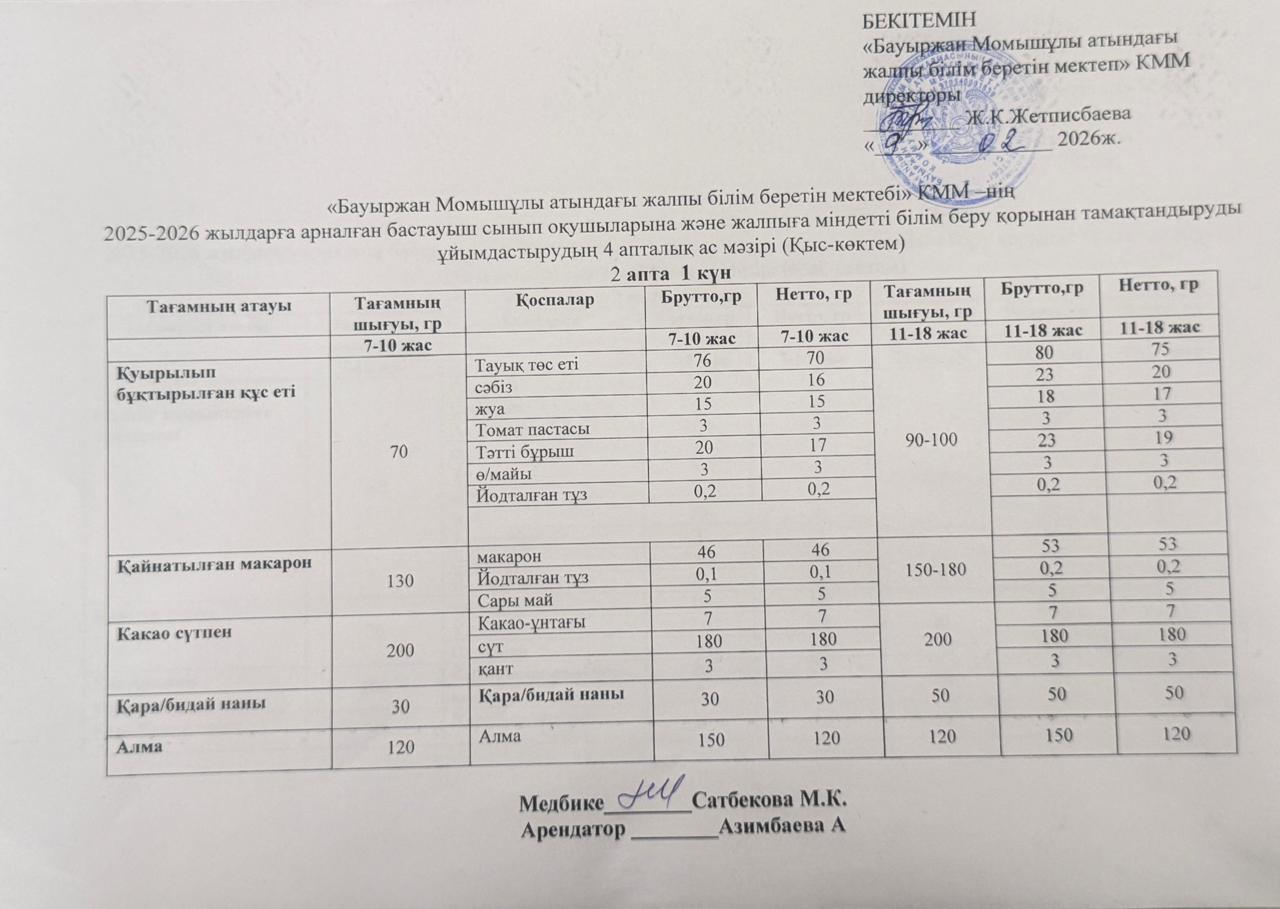 2025-2026 жылдарға арналған бастауыш сынып оқушыларына және жалпыға міндетті білім беру қорынан тамақтандыруды ұйымдастырудың 4 апталық ас мәзірі (қыс-көктем) 09.02.2026