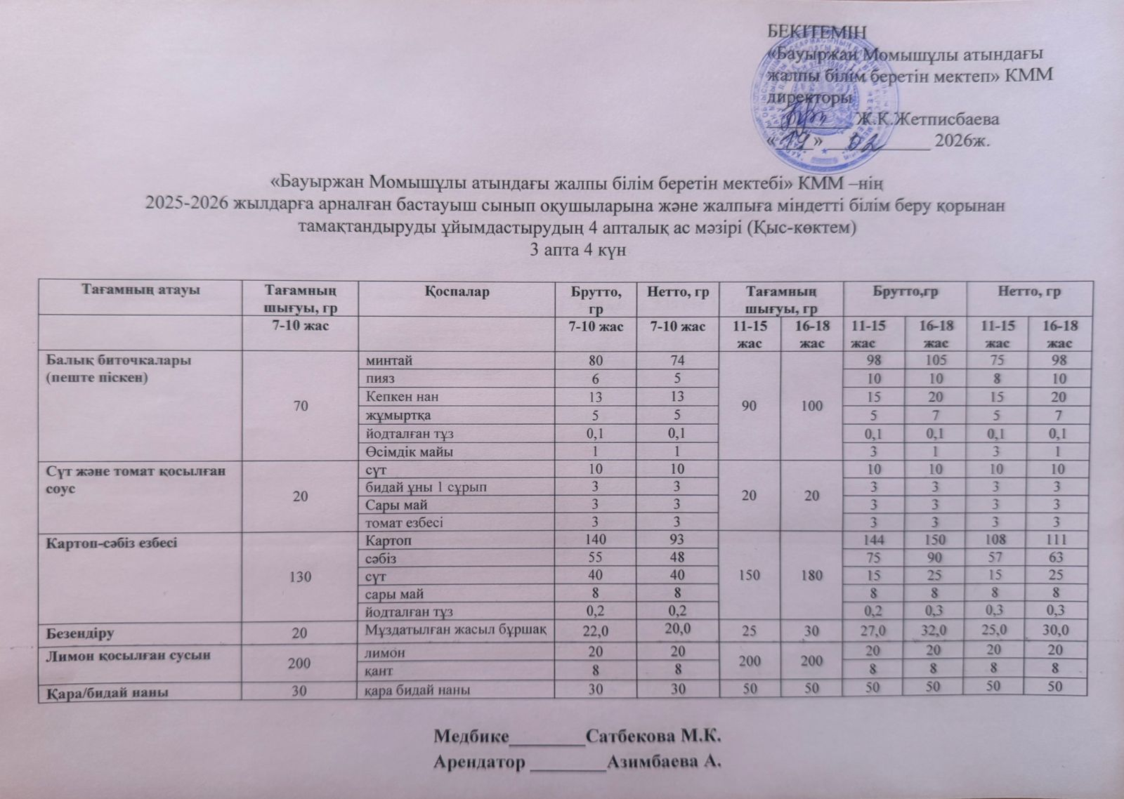 2025-2026 жылдарға арналған бастауыш сынып оқушыларына және жалпыға міндетті білім беру қорынан тамақтандыруды ұйымдастырудың 4 апталық ас мәзірі (қыс-көктем) 19.02.2026