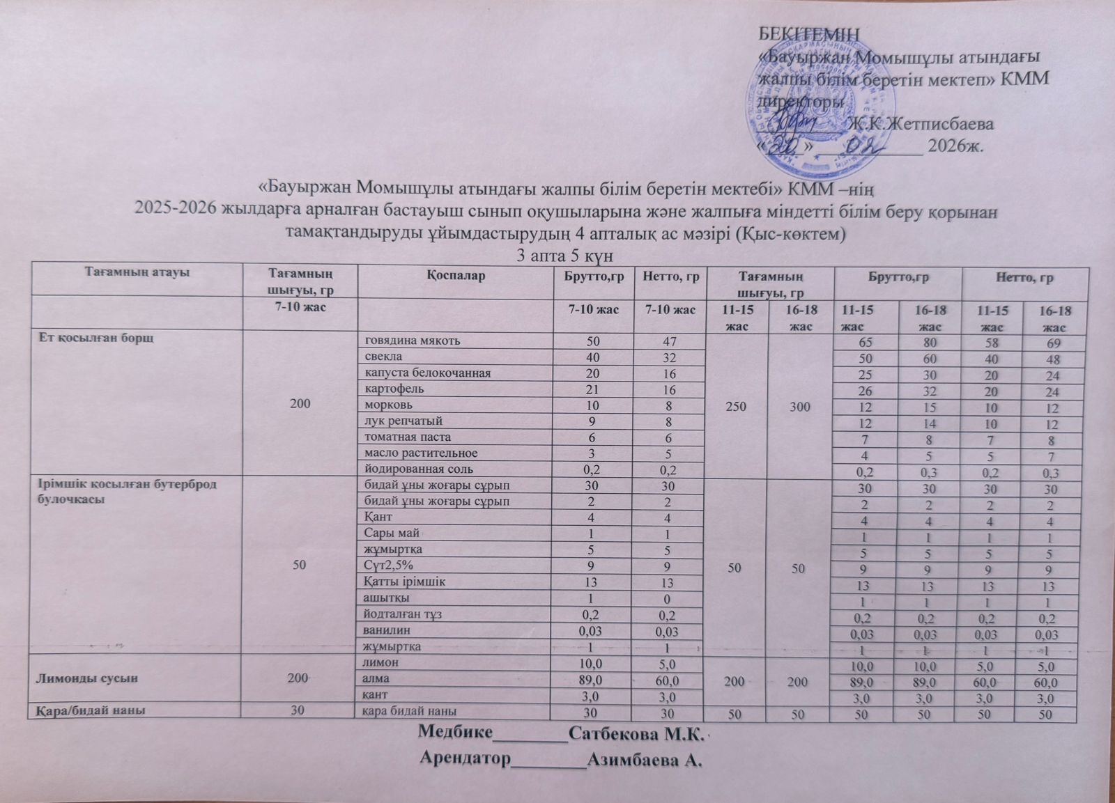 2025-2026 жылдарға арналған бастауыш сынып оқушыларына және жалпыға міндетті білім беру қорынан тамақтандыруды ұйымдастырудың 4 апталық ас мәзірі (қыс-көктем) 20.02.2026