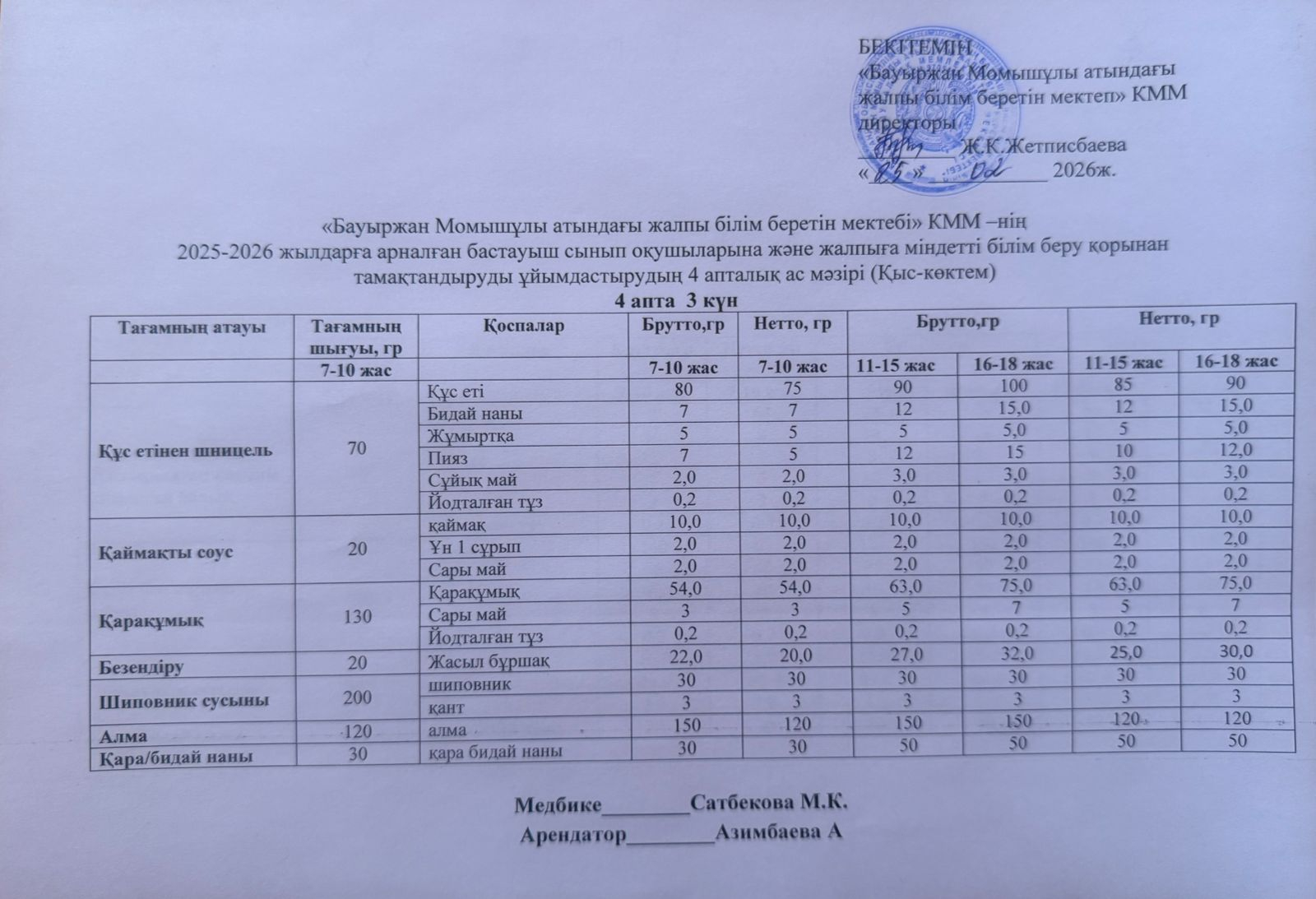2025-2026 жылдарға арналған бастауыш сынып оқушыларына және жалпыға міндетті білім беру қорынан тамақтандыруды ұйымдастырудың 4 апталық ас мәзірі (қыс-көктем) 25.02.2026