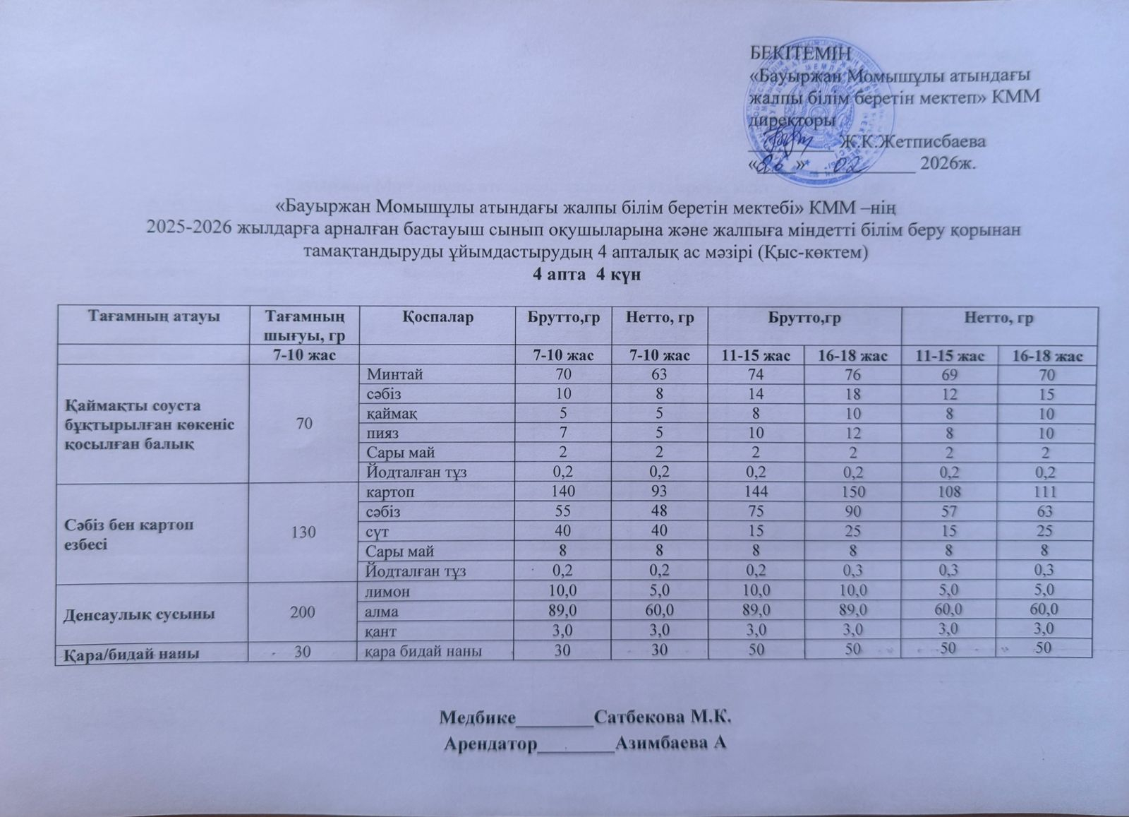2025-2026 жылдарға арналған бастауыш сынып оқушыларына және жалпыға міндетті білім беру қорынан тамақтандыруды ұйымдастырудың 4 апталық ас мәзірі (қыс-көктем) 26.02.2026