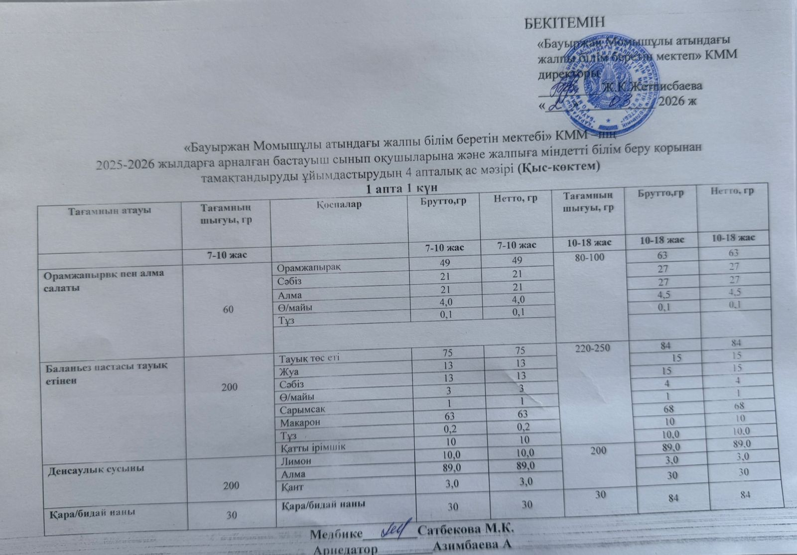 2025-2026 жылдарға арналған бастауыш сынып оқушыларына және жалпыға міндетті білім беру қорынан тамақтандыруды ұйымдастырудың 4 апталық ас мәзірі (қыс-көктем) 02.03.2026