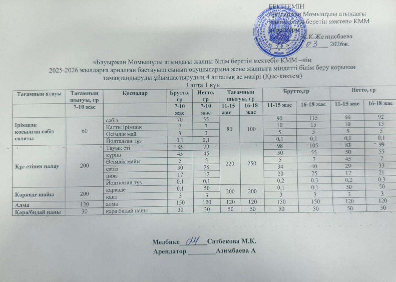 2025-2026 жылдарға арналған бастауыш сынып оқушыларына және жалпыға міндетті білім беру қорынан тамақтандыруды ұйымдастырудың 4 апталық ас мәзірі (қыс-көктем) 16.03.2026