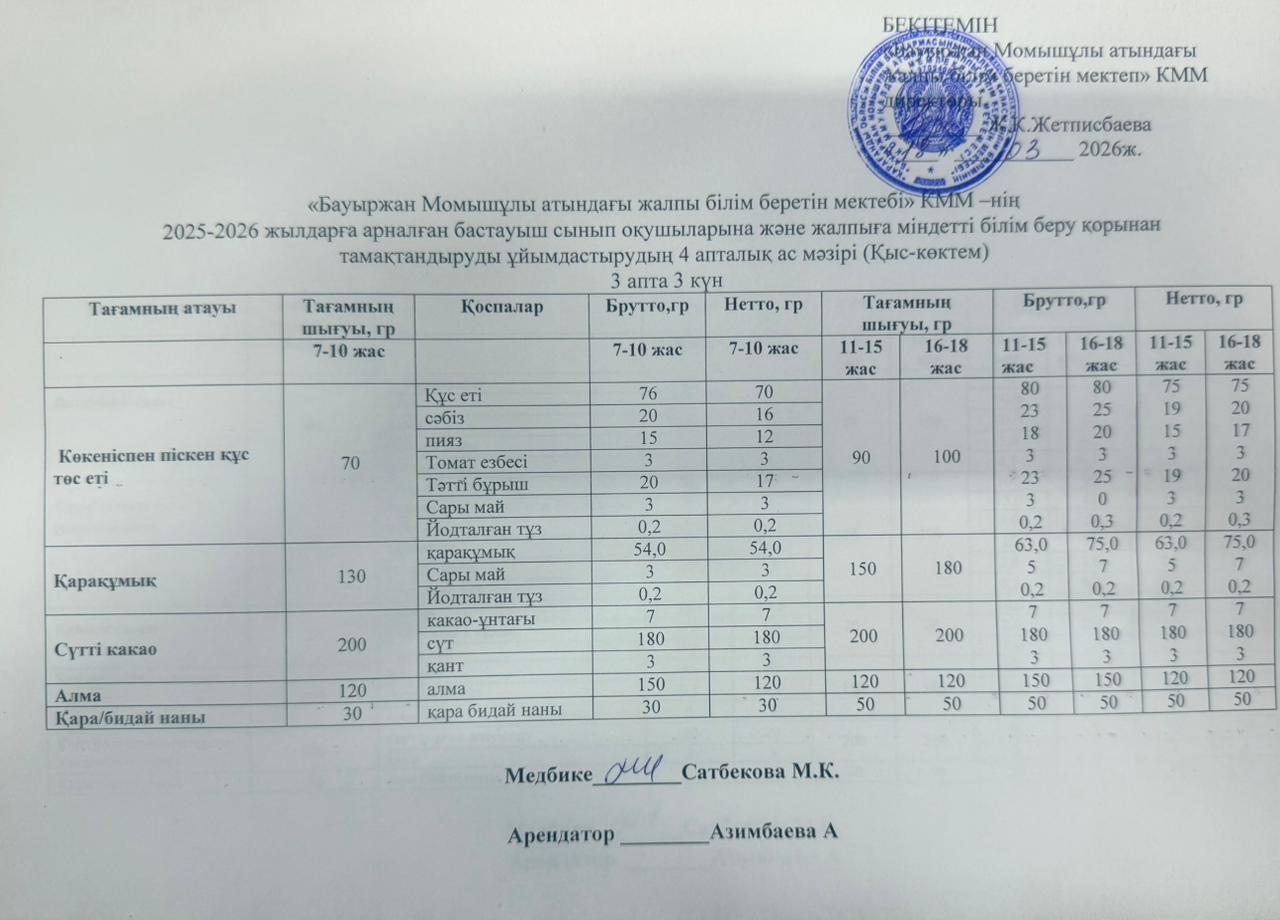 2025-2026 жылдарға арналған бастауыш сынып оқушыларына және жалпыға міндетті білім беру қорынан тамақтандыруды ұйымдастырудың 4 апталық ас мәзірі (қыс-көктем) 18.03.2026