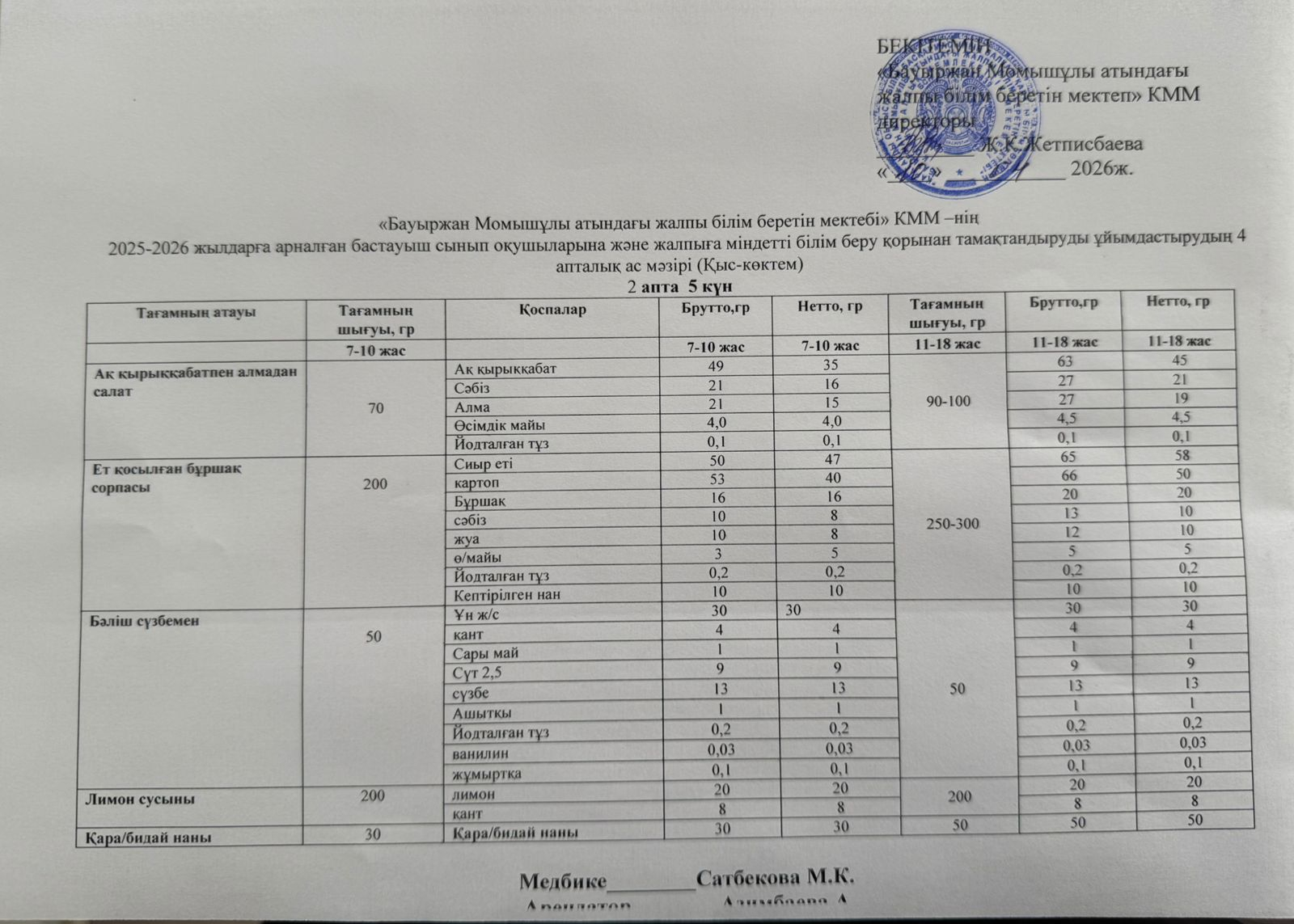2025-2026 жылдарға арналған бастауыш сынып оқушыларына және жалпыға міндетті білім беру қорынан тамақтандыруды ұйымдастырудың 4 апталық ас мәзірі (қыс-көктем) 10.04.2026