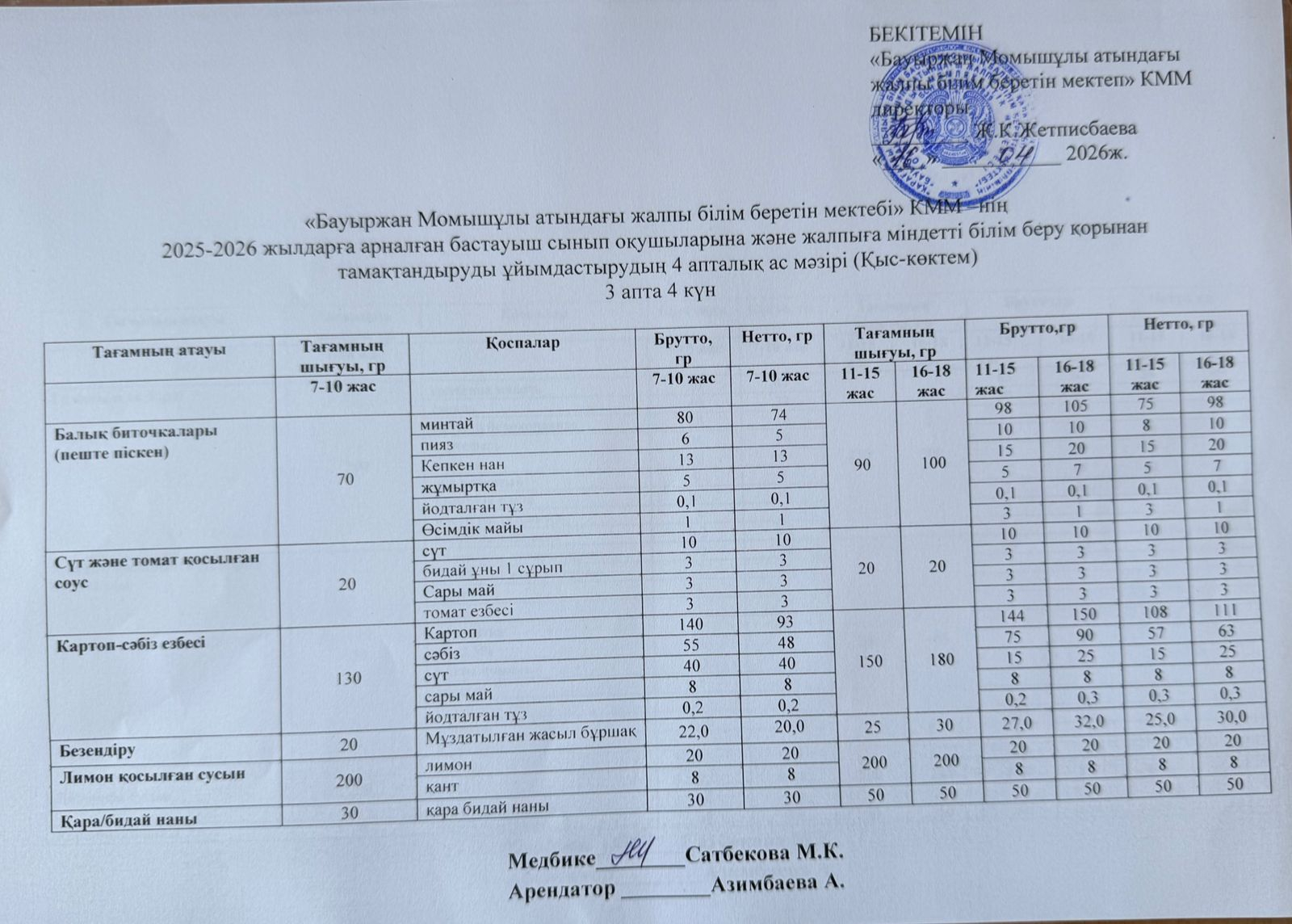 2025-2026 жылдарға арналған бастауыш сынып оқушыларына және жалпыға міндетті білім беру қорынан тамақтандыруды ұйымдастырудың 4 апталық ас мәзірі (қыс-көктем) 16.04.2026