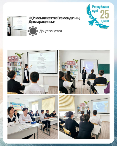 2025 жылдың 24 қазан күні Қазақстан Республикасы Мемлекеттік Егемендігі Декларациясының 35 жылдығы және Республика күніне арналған 11 сынып оқушылары арасында дөңгелек үстел форматындағы дискуссиялық сабақ өтті.