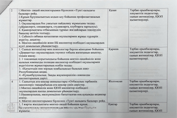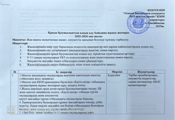 Құқық бұзылушылықтың алдын алу бойынша жұмыс жоспары 2025-2026 оқу жылы