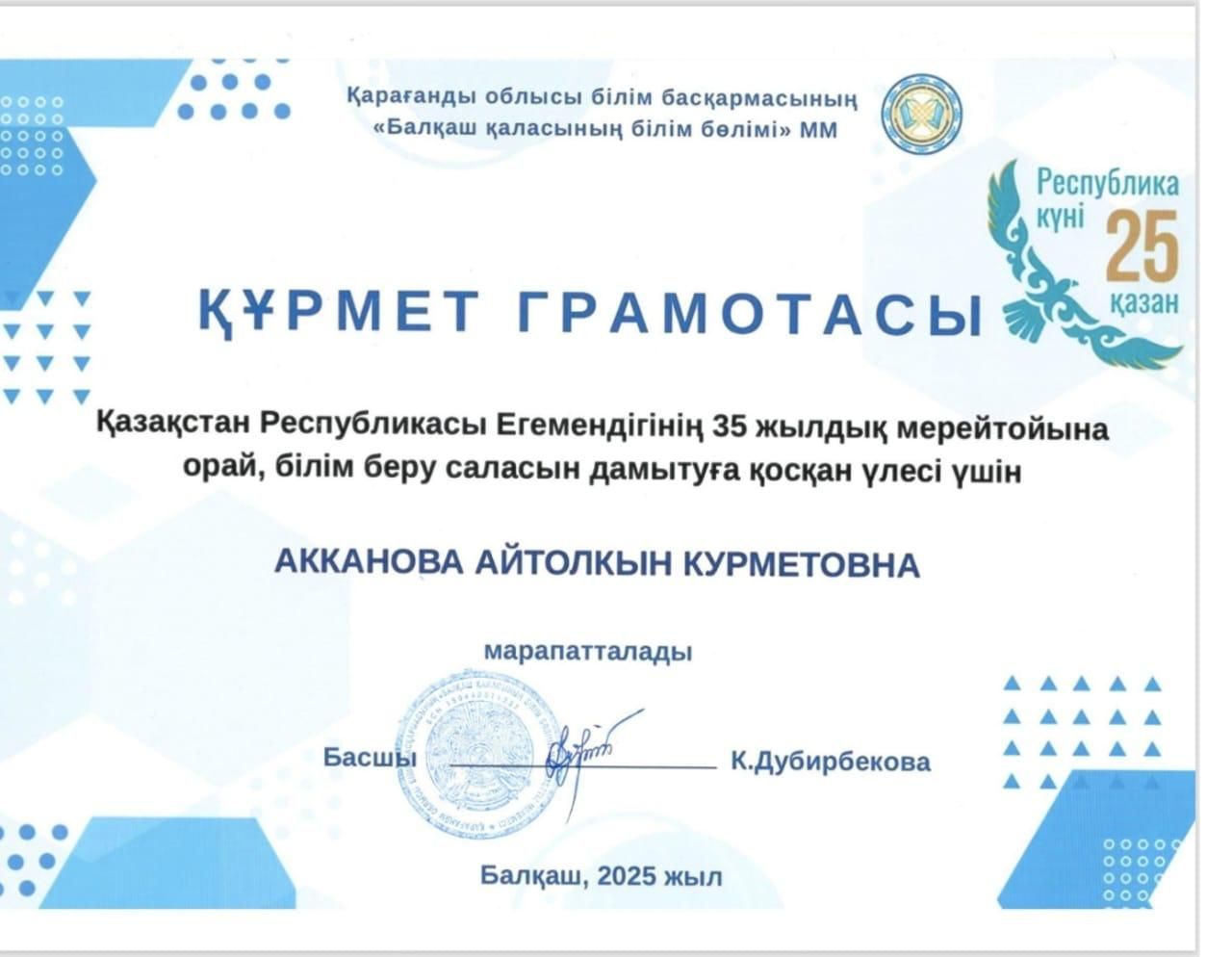 АККАНОВА АЙТОЛҚЫН КҮРМЕТОВНА
