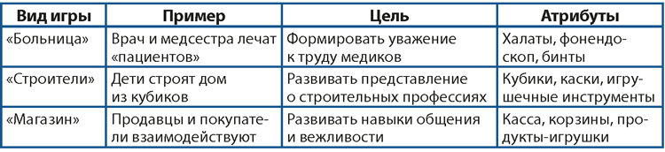 В сюжетно-ролевых играх дети могут выступать в роли врача, строителя, продавца, парикмахера или повара. Например, в игре «Больница» они лечат пациентов, используя игрушечные фонендоскопы и бинты, в игре «Строители» возводят дом из кубиков, распределяя обязанности архитектора и рабочих, а в игре «Магазин» осваивают навыки общения и вежливости, продавая и покупая товары.