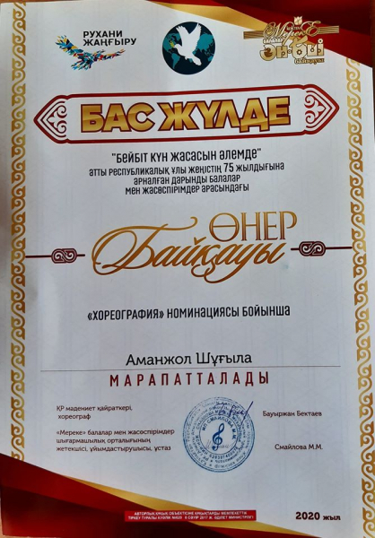 Алматы қаласында 17 сәуір мен 11 мамыр аралығында қашықтықтан өткен «Бейбіт күн жасасын әлемде» атты Республикалық Ұлы Жеңістің 75 жылдығына арналған балалар мен жасөспірімдер арасындағы Өнер байқауында хореография номинациясы бойынша Балқаш қаласы, Өнер мектебінің оқушысы Аманжол Шұғыла Бас жүлде иеленді.