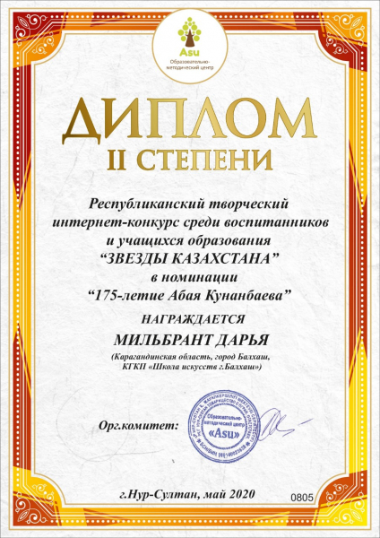 В номинации «175-летие Абая Кунанбая» Мильбрант Дарья, ученица по классу фортепиано, получила Диплом IIстепени.
