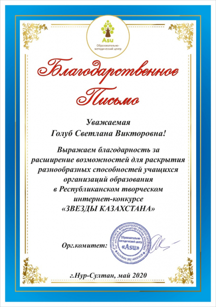В мае месяце в городе Нұр-Сұлтан прошел Республиканский творческий интернет-конкурс среди воспитанников и учащихся образования «Звезды Казахстана».