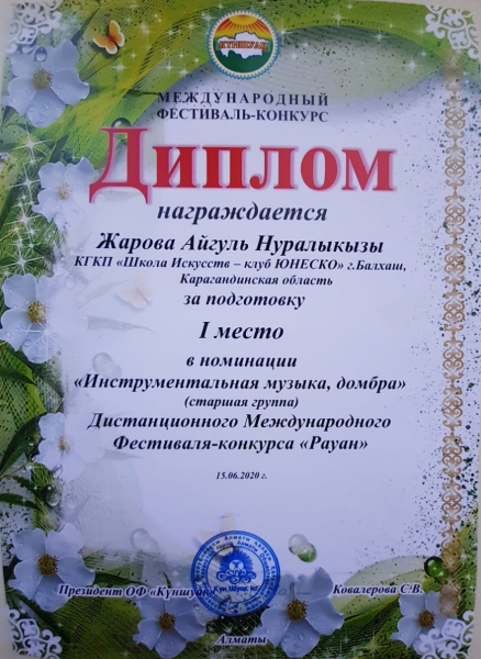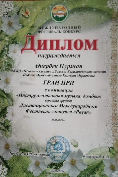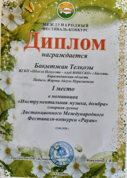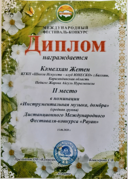 15 маусым Алматы қаласында «КҮНШУАҚ.кz.» Қоғамдық қоры ұйымдастыруымен  Халықаралық онлайн «Рауан» фестиваль- байқауына Балқаш қаласы, Өнер мектебі-  Юнеско клубының  оқушылары  домбыра номинациясы бойынша қатысып, жүлделі орындар иеленді.