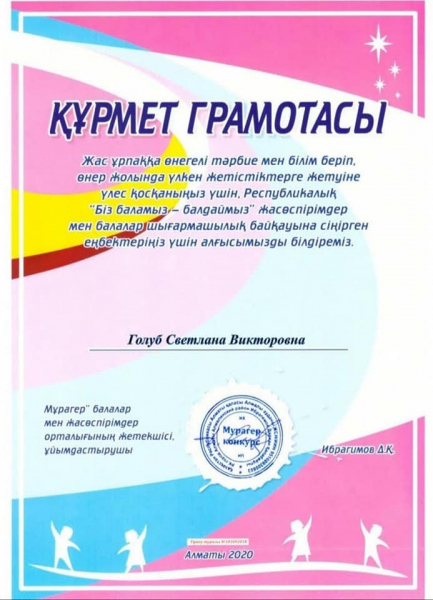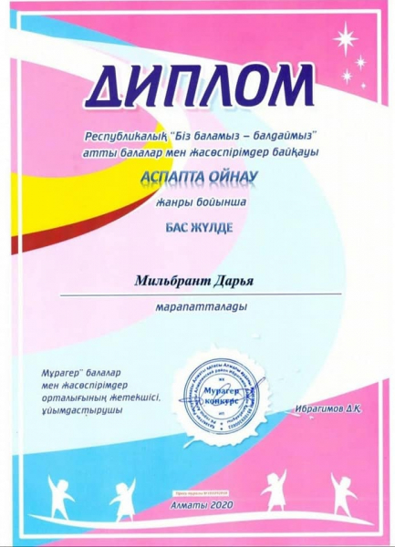 Шілде айында Алматы қаласында өткен Республикалық "Біз баламыз-балдаймыз" атты балалар мен жасөспірімдер онлайн-байқауына мектебіміздің фортепиано сыныбының оқушысы Мильбрант Дарья "Аспапта ойнау" жанры бойынша қатысып Бас жүлде иеленді.(пед.Голуб С.В.)
