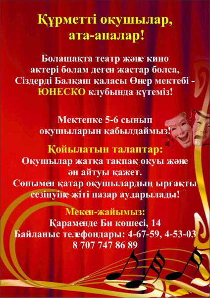 Өнер мектебі ЮНЕСКО клубы жастарды театр және актер бөліміне шақырады!
