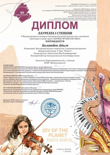 С 10.06 по 30.08.2020 г. в городе Москва прошел V Международный конкурс инструментальной музыки соло,ансамблей, оркестров и кавер-групп «ЦАРИЦА МУЗЫКА XXI ВЕКА». Наша воспитанница класса скрипки Болатбек Айым, исполнив «Минуэт» Э.Грига (концертмейстер Батыргалиева А.Б.), стала лауреатам I степени. Поздравляем ученицу и педагога Заболотную Я.В. с победой.