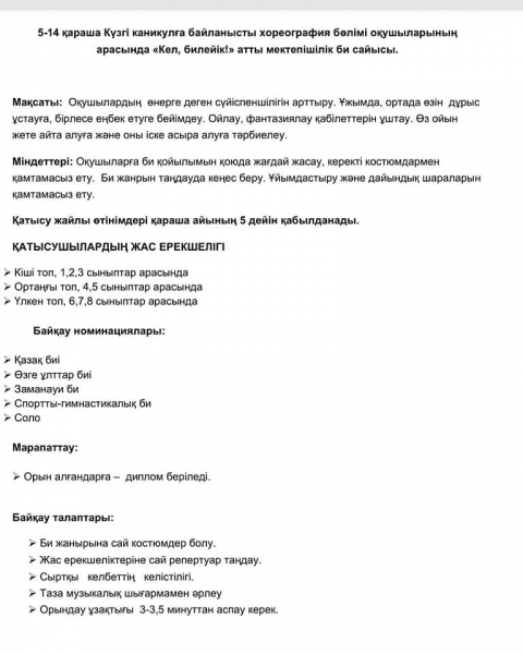 5-14 ноября, в связи с Осенними каникулами между учащимися в хореографическом отделений, пройдёт Школьный конкурс 《Кел, билейік!》