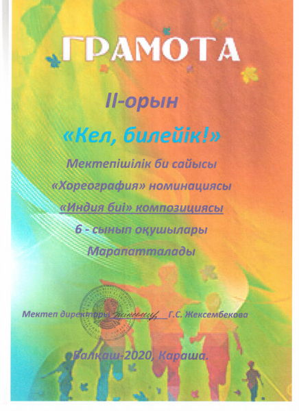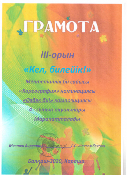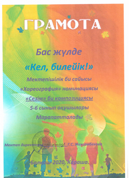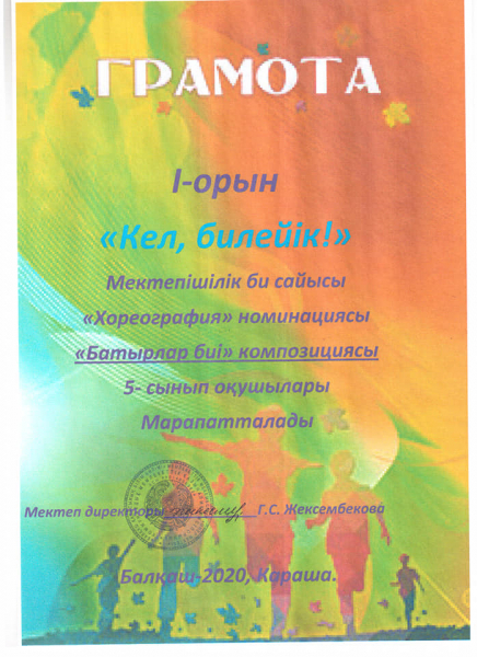 Қараша айының 5-14 аралығында Балқаш қаласы, Өнер мектебі- ЮНЕСКО клубы хореография бөлімі оқушылары арасында, күзгі каникулды тиімді өткізу және оқушылардың шығармашылығын арттыру мақсатында «Кел, билейік!» атты мектепішілік би сайысы өтті.