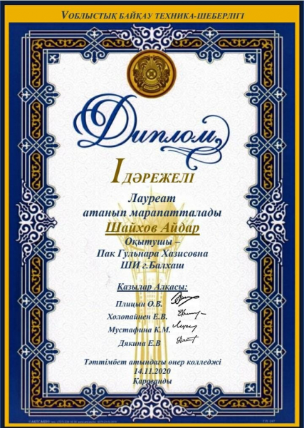 14 ноября прошел V областной конкурс технического мастерства в рамках деятельности стажерской площадки на базе Карагандинского колледжа искусств им. Таттимбета. Организаторы конкурса: «Учебно-методический центр развития образования Карагандинской области». Конкурс проводился в онлайн режиме. Нашу школу представил ученик 3 класса Шайхов Айдар. Продемонстрировав техническую виртуозность, выдержку и артистизм Айдар стал лауреатом I степени. Таких высоких результатов ученик добивается не в первый раз, и все благодаря своему усердию, трудолюбию и неустанному контролю и поддержке педагога – Пак Гульнары Хазисовны.