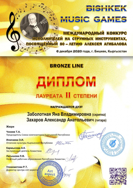 В Международном конкурсе посвященном 80-летию Алексея Агибалова исполнителей на струнных инструментах «Bishkek music games», принял участие дуэт педагогов по классу скрипки Заболотная Яна Владимировна и преподаватель по классу гитары Захаров Александр Анатольевич с композицией Н. Паганини «Ларго и Аллегретто».