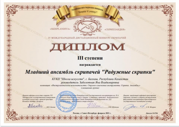 IV Халықаралық қашықтықтан "SKRIPLANDIA" кәсіби скрипкашылар конкурсында мектебіміздің "Радужные скрипки" кіші скрипкашылар ансамблі "Забавные гаммы"! шығармасымен қатысып, 3 орын иеленді.