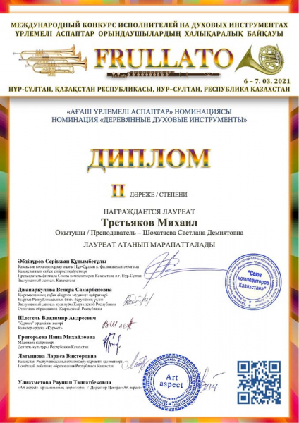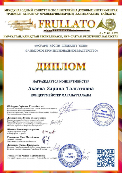 6-7 марта 2021 года, в городе Нур Султан, прошёл Международный конкурс молодых исполнителей на духовых инструментах - «FRULLATO». Организатор конкурса - Центр творческих инициатив «Art aspect», при поддержке Союза композиторов Республики Казахстан. Конкурс проходил в номинациях : «деревянные духовые инструменты» (соло, ансамбли) «медные духовые инструменты» (соло, ансамбли) «народные духовые инструменты» (соло, ансамбли) «камерный ансамбль» (смешанный инструментальный состав) «концертмейстерское мастерство». И в девяти возрастных категориях. Участниками конкурса страны Казахстан, Россия, Кыргызстан, Узбекистан, Польша.
