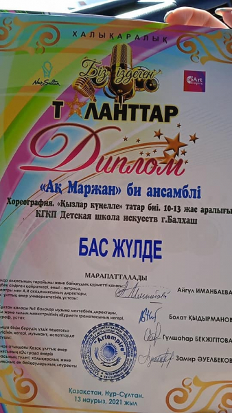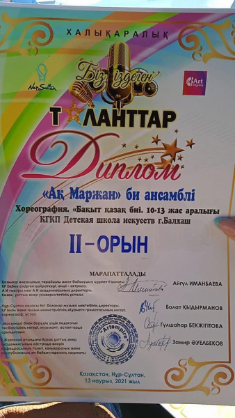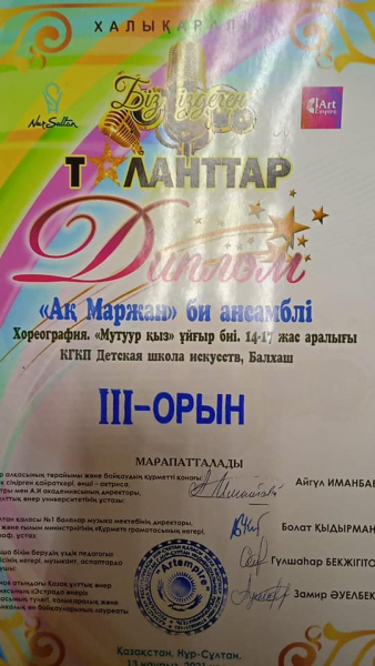 13 наурызда Нұр-Сұлтан қаласында өткен "Біз іздеген таланттар" халықаралық байқауында, Балқаш қаласының Балалар өнер мектебінің "Ақмаржан" би ансамблі 4 би композициясын көрсетті. Байқаудың қорытындысы бойынша балқаштық бишілер 2 БАС ЖҮЛДЕ, II орын, ІІІ орын алды!