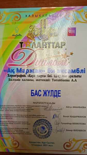 На международном конкурсе проходившем 13 марта в г.Нур-Султан "Біз іздеген таланттар", хореографический ансамбль "Ақмаржан" детской школы искусств города Балхаш представил 4 хореографические композиции. По итогам конкурса балхашские виртуозы танца заняли 2 ГРАН ПРИ, ІІ место, ІІІ место!
