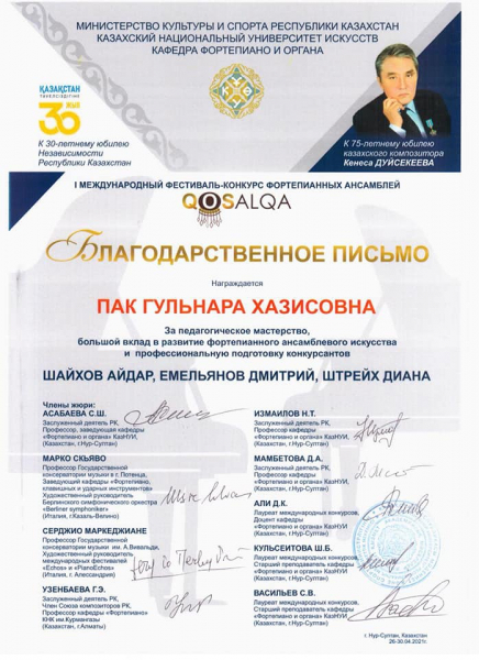 в г. Нур-Султан был проведен *I МЕЖДУНАРОДНЫЙ ФЕСТИВАЛЬ — КОНКУРСА ФОРТЕПИАННЫХ АНСАМБЛЕЙ «QOS ALQA»*