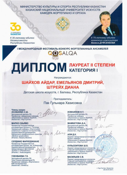 *Балхашскую детскую школу искусств представляло фортепианное трио «Di-Ai-Di» /* Емельянов Дмитрий, Шайхов Айдар, Штрейх Диана, кл.преп. Пак Г.Х./. Ребята стали лауреатами II степени.