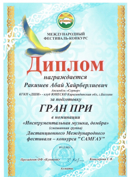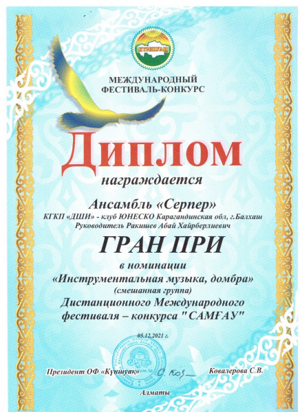 5 желтоқсан айында Алматы қаласында «Күншуақ» қоғамдық қоры ұйымдастыруымен қашықтықтан Халықаралық «Самғау» фестиваль- байқауы болып өтті. Байқауға мектебімізден «Серпер» домбырашылар ансамбльі қатысып БАС ЖҮЛДЕ иеленді. (жетекші: Ракишев А.Х.)