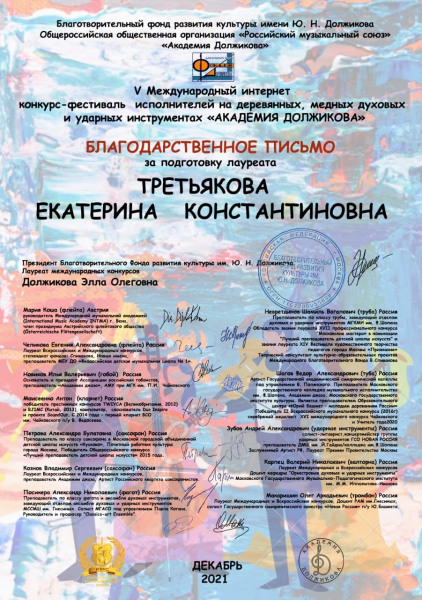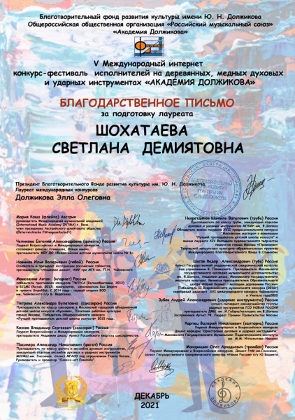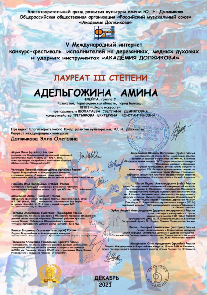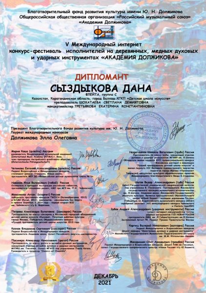 01.12.2021. прошёл 5-й Международный интернет-конкурс на деревянных, медных духовых и ударных инструментах «АКАДЕМИИ ДОЛЖИКОВА», в городе Москва (Россия). Учредители конкурса : - благотворительный фонд развития культуры им. Ю.Н. Должикова; - общероссийская общественная организация «Российский муз. союз»; - «Академия Должикова»; Конкурс призван всемерно способствовать развитию творчеству юных исполнителей, совершенствованию их профессионального мастерства, пропаганде и широкой популяризации музыки для духовых инструментов. В каждой номинации пять возрастных категорий. В номинации «флейта», в возрастной группе «С», от нашей школы приняли участие : Дана Сыздыкова (3 класс), Амина Адельгожина (5 класс). Всего в этой группе участников было 41 флейтистов. Участники были из России, Белоруссии, Казахстана, Прибалтики, Кипра.