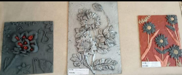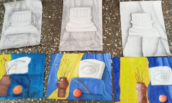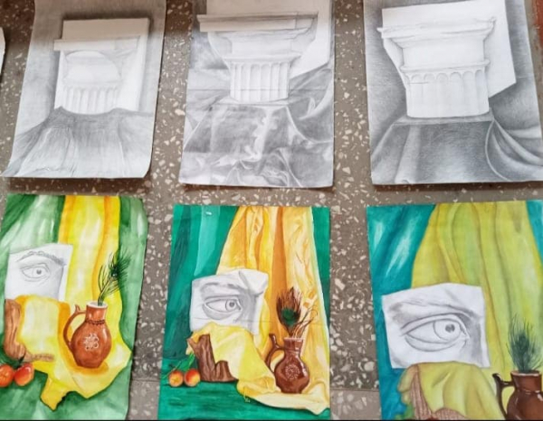 Учащиеся 3-4 классов исполнили натюрморты в технике гуашь по предметам живопись, скульптура, компьютерная графика, также можно увидеть рисунки гипсового капителя и орнаменты в графической технике. Над скульптурой работали в портретном жанре и технике рельефности из скульптурного пластилина. Работы по компьютерной графике выполнены в виде календаря и тематического натюрморта.