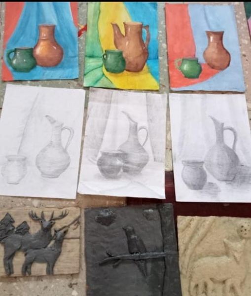 0-2 сынып оқушылары сурет, кескіндеме, мүсін, компьютерлік графика пәндері бойынша натюрморттарды графикалық, гуаш техникасында ал мүсін бойынша өсімдіктер мен жануарлар әлемінің рельефтерін көрсетті.
