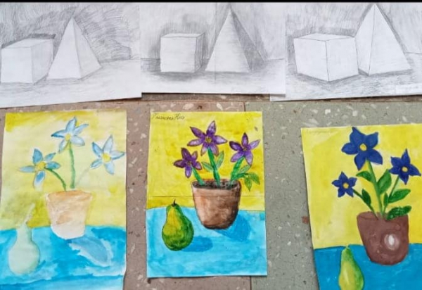 У учащихся 0-2 классов можно увидеть натюрморты по предметам рисунок, живопись, скульптура, компьютерная графика в технике графики, гуашь, а по скульптуре-рельефы растительного и животного мира.
