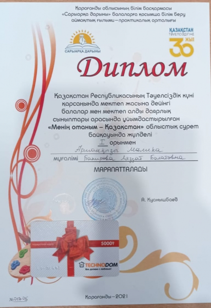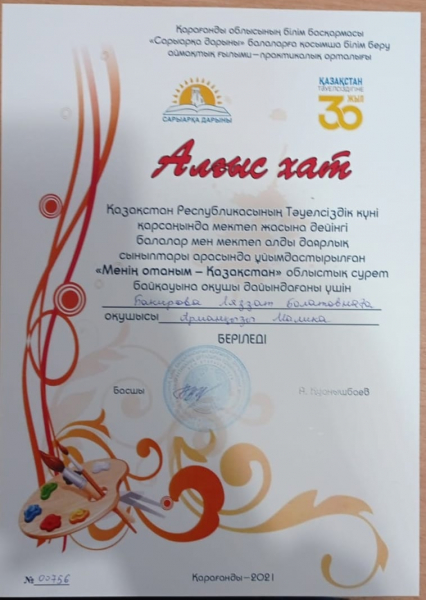 Мектепке дейінгі балалар мекемелеріне және мектеп алды даярлық сыныптарына арналған қашықтықтан «Менің Отаным- Қазақстан» Облыстық сурет байқауына мектебіміздің көркемөнер бөлімінің 5-6 жас тобының оқушысы Арманқызы Малика қатысып, жүлделі 1 орын иеленді. Қүттықтаймыз!!! (педагог: Бакирова Л.Б.)