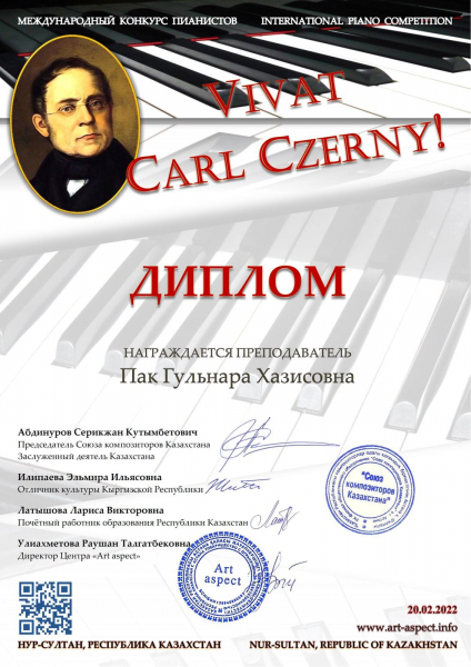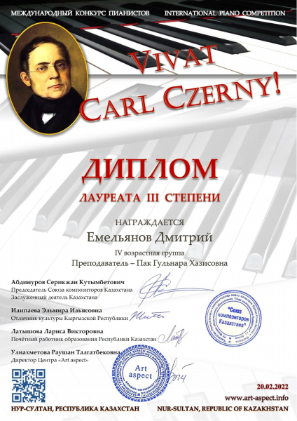 Ученик 5 класса фортепиано (педагог Пак Г.Х.) принял участие в международном конкурсе пианистов «Vivat, Karl Czerny!» в городе Нур-Султан на лучшее исполнение этюдов Черни. Дмитрий сыграл В старшей возрастной группе этюды из ор.299 «Школа беглости» и занял почетное 3 место