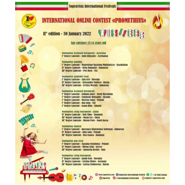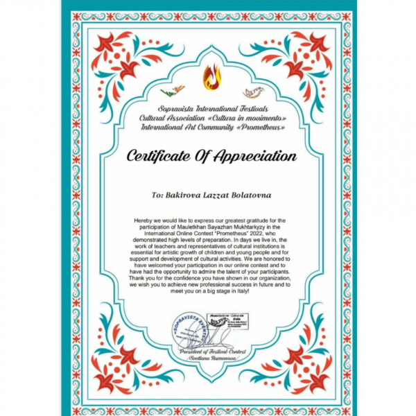 Италяның Тоскана қаласында өткен арт-проект «Сопровиста» Халықаралық «Прометей» онлайн фестиваль- байқауына мектебіміздің көркемөнер бөлімінің 4-сынып оқушысы Маулетхан Саяжан 13-14 жас жеткіншектер арасында «живопись»жанры бойынша қатысып, 1-жүлделі орынға ие болды.
