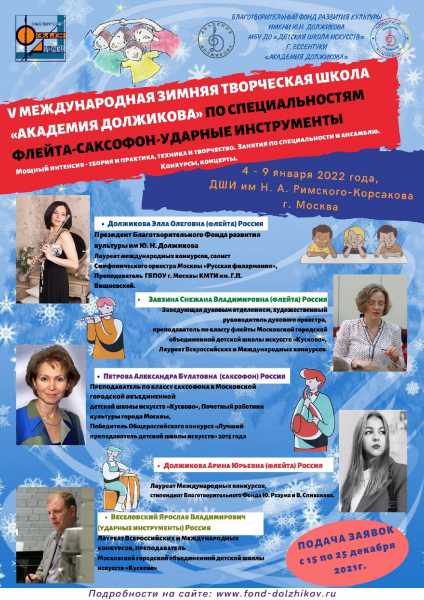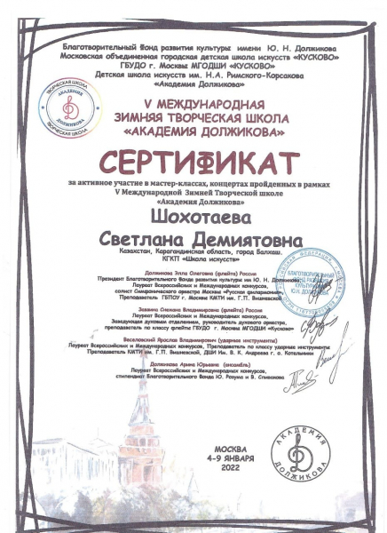 - Выявление, поддержка и сопровождение одаренных детей в сфере культуры и искусства; - Укрепление преемственности системы художественного образования в сфере культуры и искусства; - Обмен опытом между педагогами и исполнителями различных регионов России, стран ближнего и дальнего зарубежья. Занятия проходили с десяти утра до шести-восьми вечера, в стенах ведущей, знаменитой школы искусств имени Римского-Корсакова. Не смотря на насыщенность дней занятиями и мероприятиями, время пролетало незаметно. Индивидуальные занятия с каждым участником, работа с концертмейстером, работа в ансамбле, технический зачёт, где Амина заняла в своей группе второе место и ежедневные выступления всех участников школы – вот в таком плане проходили дни зимней школы. А в последний день, на сцене большого концертного зала, прошло закрытие, где все участники получили сувениры от орг. комитета, сертификаты и прошло выступление каждого участника, и в ансамбле. Очень отрадно, что председатель орг. комитета Э. О. Должикова оценила по достоинству нашу Амину, отметив, что за пять лет обучения Амина достигла очень отличных результатов, и поблагодарила педагога Шохатаеву Светлану Демиятовну за поддержку и распростронение методики Ю.Н.Должикова. И пожелала Амине связать судьбу с Музыкой.