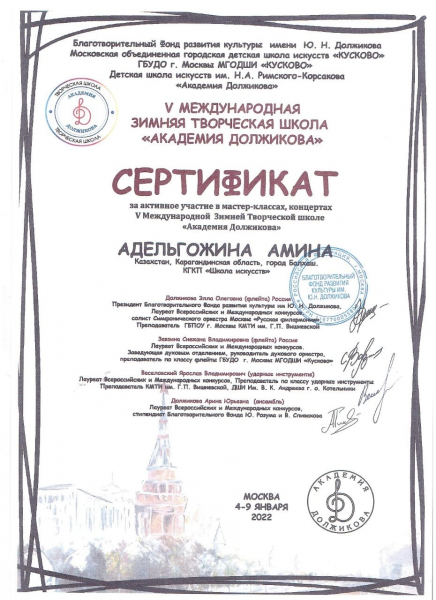 Амина Адельгожина ученица выпускного класса флейты, Лауреат многих Международных конкурсов в сольной и в ансамблевой номинациях, стипендиат имени К.Байсеитовой, как неоднократная победительница конкурса им. Ю. Н. Должикова, была приглашена на мастер класс «Зимней школы», в город Москва. Это высокая честь для нашей школы – быть приглашёнными на мастер класс к высоко квалифицированным, известным во всём Мире, преподавателям : Э.О.Должикова, С.В.Завзина, А.Ю.Должикова, А.Б.Петрова, Я.В.Веселовский. Международная Зимняя творческая школа «АКАДЕМИЯ ДОЛЖИКОВА» призвана всемерно способствовать развитию творчества юных и профессиональных исполнителей, совершенствованию их мастерства, пропаганде и широкой популяризации музыки для духовых инструментов. Целями «Зимней школы» были: